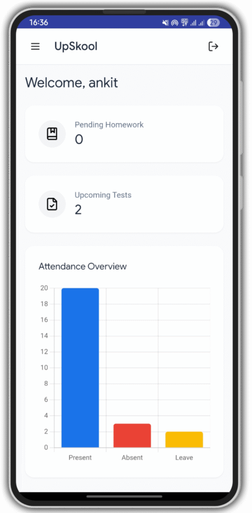 UpSkool is not just another school software — it’s designed to reduce teacher workload by 70% and give parents 100% transparency in student performance. From homework to attendance, tests to reports — everything is automated and accessible. Teachers save hours every week, parents stay happy, and students stay motivated. And the best part? It’s plug-and-play — no extra IT staff needed.